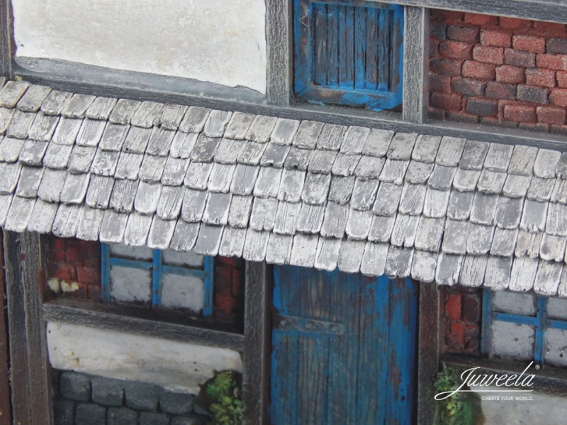 Modellbau mit individueller Gestaltungsmöglichkeit: Darstellung eines eindeckten oder zerstörten Daches; ebenso ist loses Streuen oder Stapeln möglich.