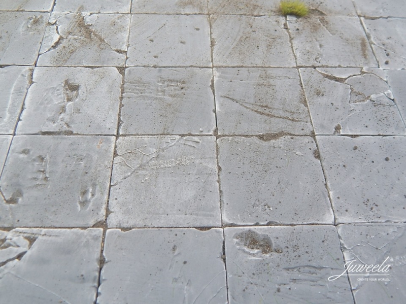 Platten aus Beton wie sie in jedes Diorama prima passen. Diese hier kommen ordentlich benutzt daher: Risse, Ab-/Brüche, Abschürfungen, Abnutzungen, Ausbesserungen, Löcher in denen das Gras wächst.