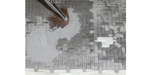 Wie gewohnt einfach mit einem Pinsel trocken in die Fugen fegen. Wenn das Material fest werden soll, z.B. bei Modulen oder Dioramen, die auch mal hochkant gestellt werden, einfach einen feinen Wassernebel auf die Fugen sprühen - das Material härtet aus. Nicht zuviel Wasser verwenden, die Fugen könnten sonst ausgeschwemmt werden.