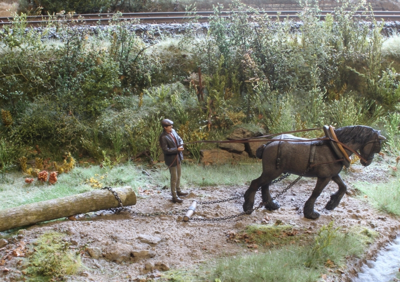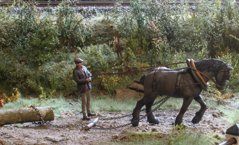 MaKo Rückepferd im Einsatz. Maßstab 1:32 / Spur 1. Pferd und Knecht sind 3D Druck von 3D-Studio.be . Das Ortscheid (Querholz), Ketten, Kleinteile eigene Entwicklung. Alle Ösen in Metall. Die Zügel sind aus festem Papier und in Weißleim getränkt. Nach Positionierung auf der Anlage (Figuren habe 1mm Bohrung im Fuß / Huf) kann man diese anfeuchten und in durchhängende Position bringen.
